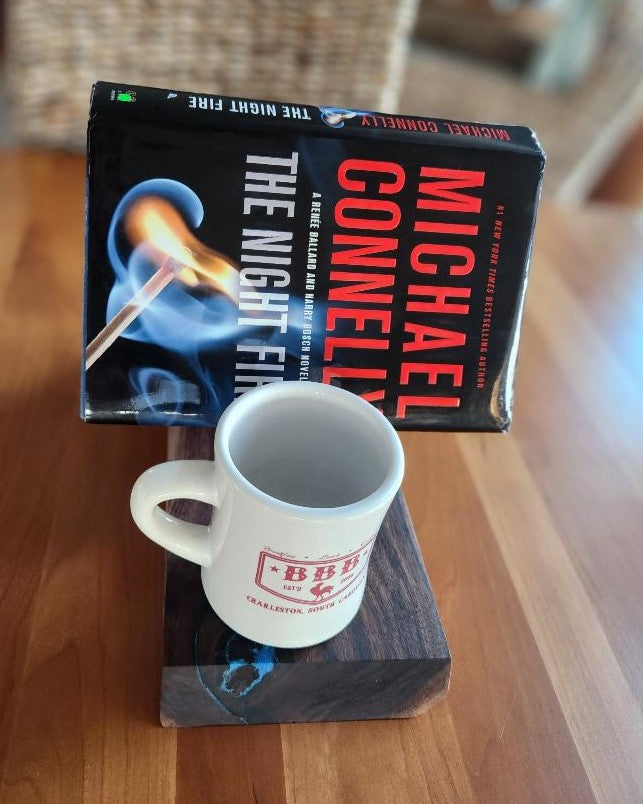 This beautiful black walnut book caddy features live edges, showcasing its organic shape and distinctive grain patterns. Use this portable book stand to hold books or magazines while adding a rustic touch to any space. There's also a place for a cup or small bowl for snacking.